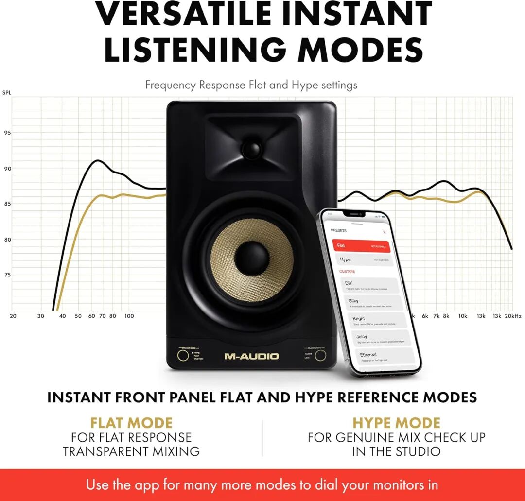 Forty 系列目前共有两个型号 Forty Sixty 和 Forty Eighty(以下简称 60 和 80),就外观和设计理念而言,它们充分体现了 M-AUDIO 这个 “音频老炮儿” 与时俱进的创新精神,M-AUDIO 的设计师采用了金色字体和金色低音扬声器的外观,来搭配黑色箱体与之呼应,保证专业属性的同时,又增添了几分 “豪奢感”(难怪在嘻哈界大受欢迎呢),另外我们知道在这个科技“飞速”发展的时代,监听音箱的 “市场挑战” 更加的严苛,谁了解了终端消费者的需求,谁才有机会胜出并锁定市场的份额,也就是现在常说的 “颗粒度” 要精准。而 Forty 系列监听音箱可与手机 App 连接使用,并预制自定义的音频效果、5.3 真无线立体声 (TWS) 音频传输、以及为职业混音/编曲工作者提供的监听模式场景选择,这些小细节你心动了吗?