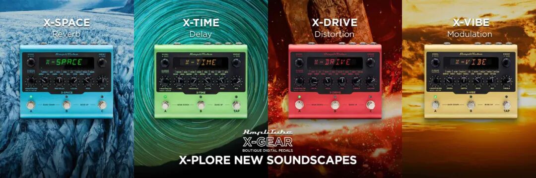 AmpliTube X-Gear系列单块效果器,不仅为您汇集和提供了广泛应用功能的顶级音色效果,还在不影响原始音色的基础上,大大增加了多变性和可调整性,目前发布的4个搭载DSP运算内核驱动单元的单块效果器,不仅涵盖了失真 (X-Drive)、混响 (X-Space)、延迟 (X-Time) 和调制 (X-Vibe)等4大常用单元音色,其中每个单块效果器中,还包含16种不同风格的预置可选音色