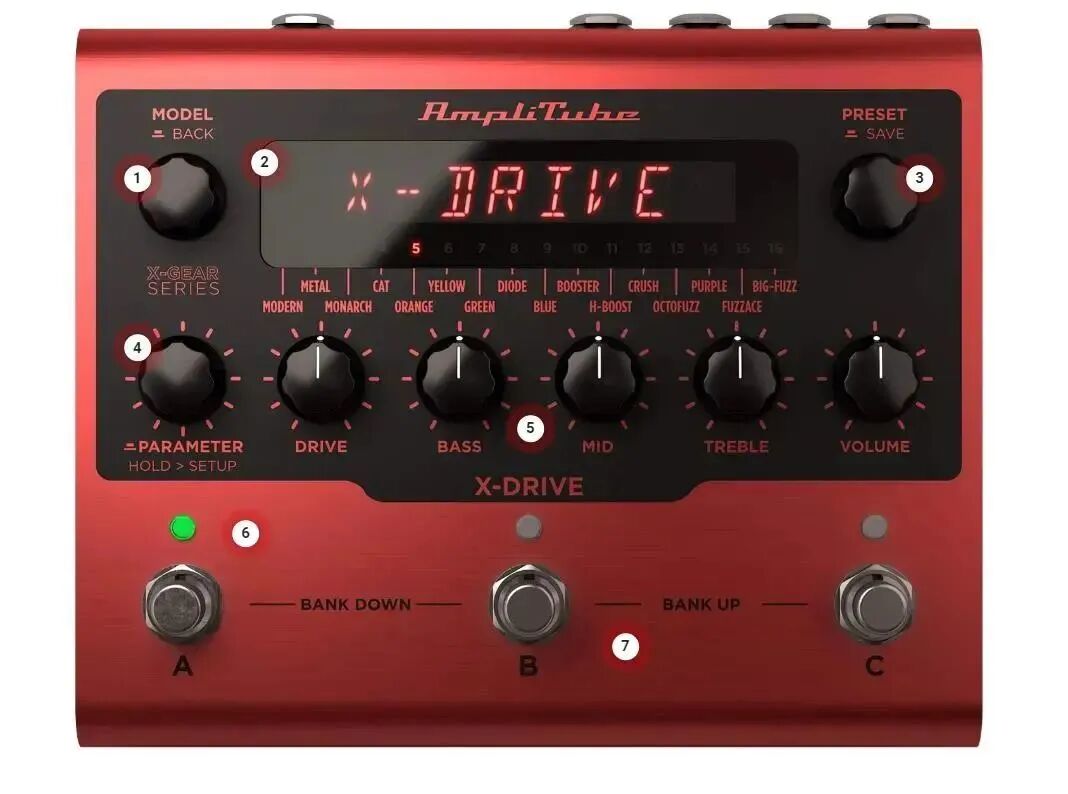 5.MAIN PARAMETERS(主要参数)控制旋钮:包含DRIVE(过载)、BASS(低音)、MID(中音)、TREBLE(高音)、VOLUME(音量)控制等