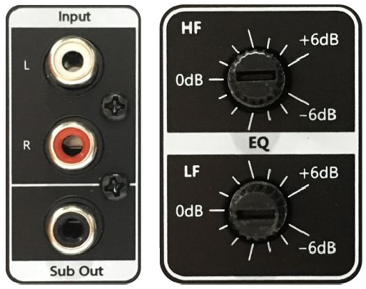主机背部上HF高频、LF低频的EQ均衡旋钮可在-6dB至+6dB范围内调节,用户根据需求风格调整音质(上图右)